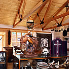 This contemporary retail space combines many traditional design elements to echo the surrounding community. Wood accents on the interior including the wood ceiling with dramatic exposed trusses and elegant staircase and doors bring a traditional warmth and play of light to the inside spaces. Humble and traditional exterior details including the red pitched roofs, high courtyard wall, and wooden gate tie the project to its neighborhood.